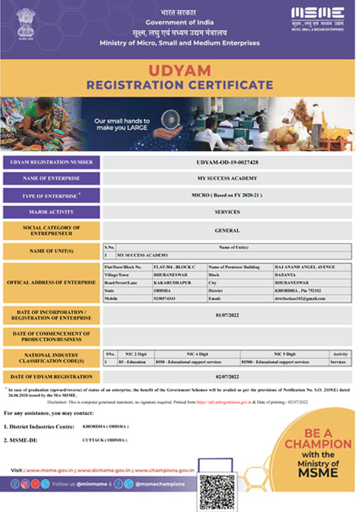 My Success Academy also registered under MSME , Govt of India . Founder Prof.(Dr.) Trilochan Nayak believes that education is valueless without charity. His slogan – Academy for education, academy for charity gathers many more accolades across India.
